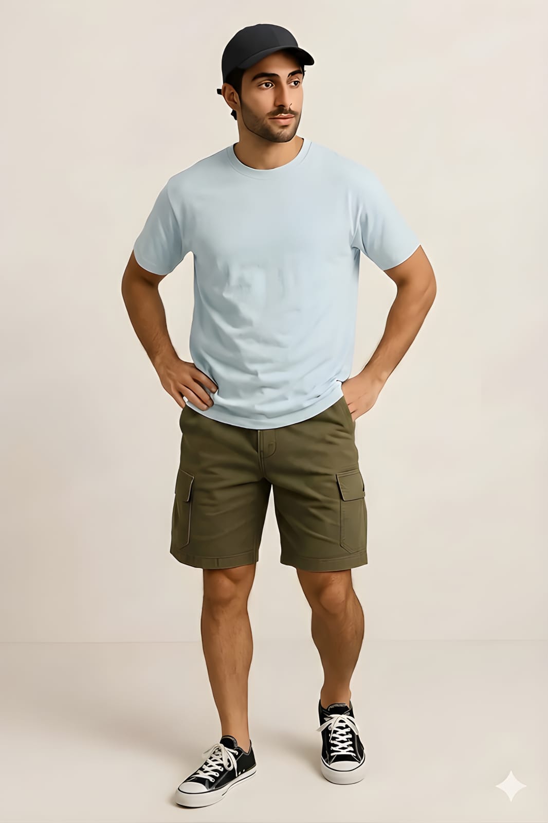 Street Style Look: Is sky white tee ko Olive Green shorts aur ek Black baseball cap ke saath pair karein jaisa ki image mein dikhaya gaya hai.